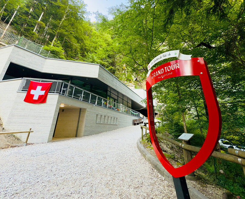 Aux Grottes de Vallorbe, les voyageurs du Grand Tour peuvent s’arrêter devant le cadre photo officiel du Grand Tour de Suisse, facilement identifiable grâce à son cadre rouge, conçu pour immortaliser chaque arrêt. Ce spot photo permet aux visiteurs de partager leurs souvenirs de voyage avec la communauté du Grand Tour en ajoutant, par exemple, les hashtags officiels sur les réseaux sociaux.