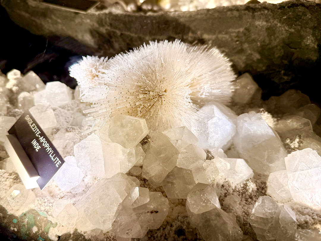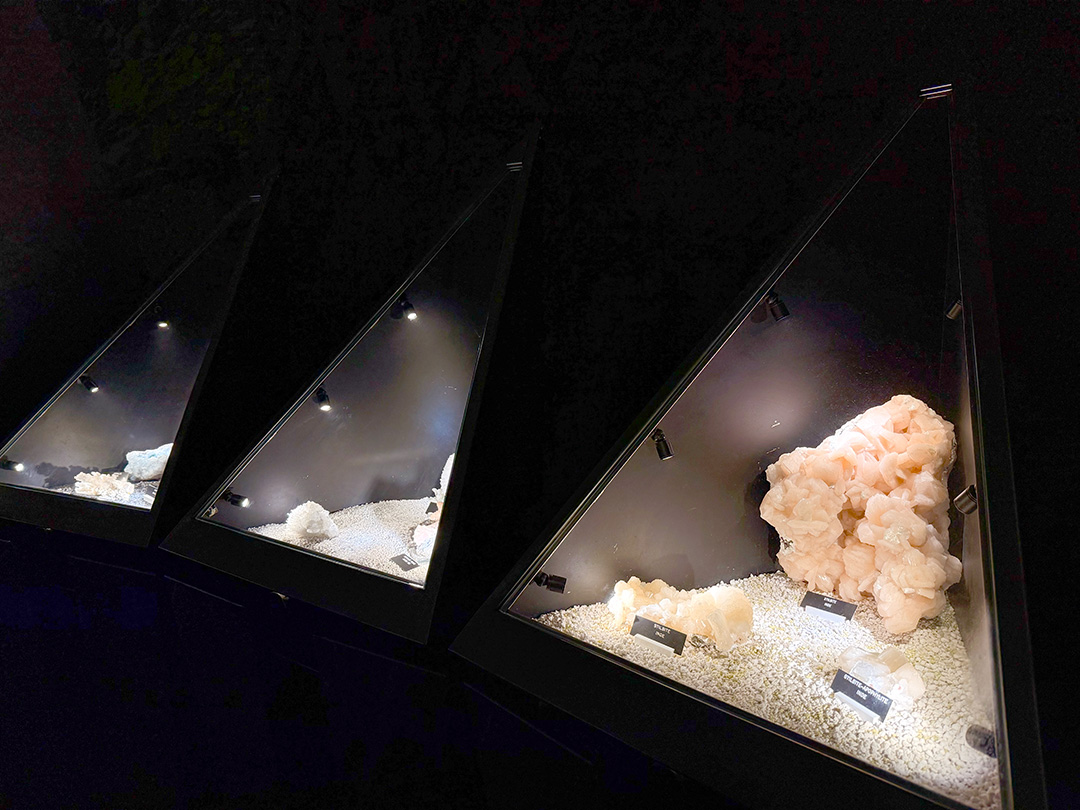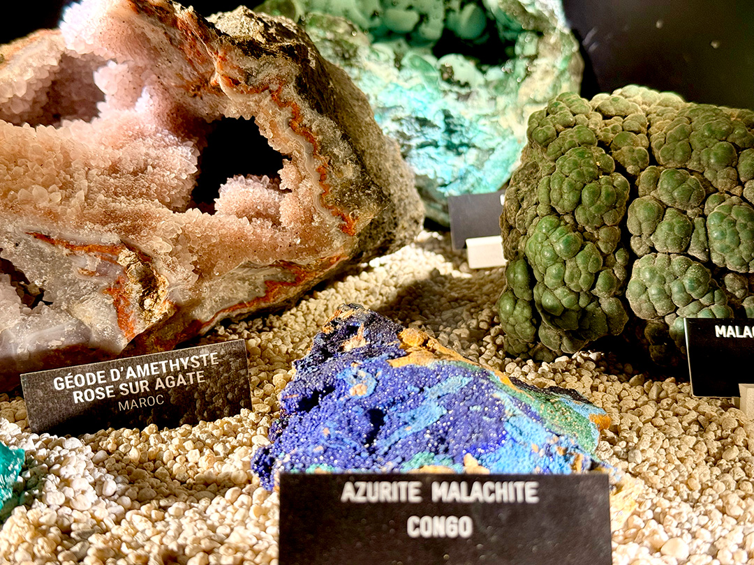 Du quartz translucide aux améthystes violettes, en passant par les calcites lumineuses, chaque pierre révèle sa couleur, sa forme et son histoire. On peut aussi admirer des pyrites étincelantes, des malachites vertes ou encore des saphirs et topazes qui témoignent de la richesse et de la diversité du monde minéral. Répartis dans les quatre alvéoles des grottes, ces trésors naturels sont présentés pour émerveiller, éveiller la curiosité et raconter les secrets de la Terre.