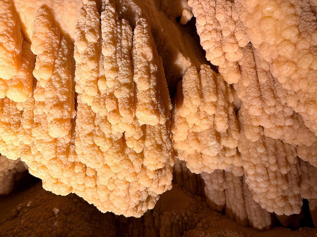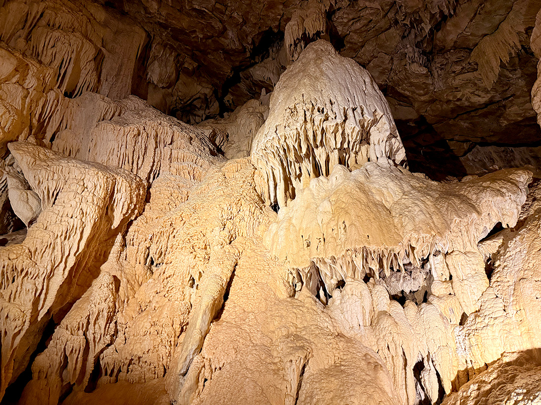Les parois, sculptées par des millénaires d’érosion, sont richement ornées de formations minérales spectaculaires aux reflets subtils, créant un décor naturel d’une beauté rare.